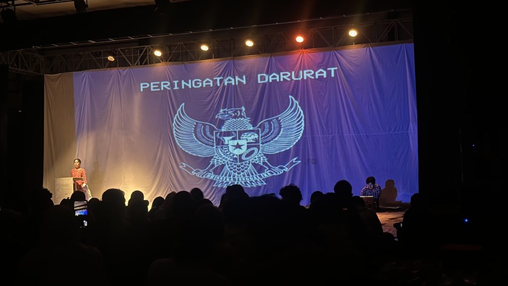 Penggunaan proyektor menjadi salah satu elemen yang menonjol dalam pementasan. Selain memperluas ruang dan waktu di atas panggung, medium tersebut juga dimanfaatkan sebagai bagian dari penyampaian data yang mendukung narasi.